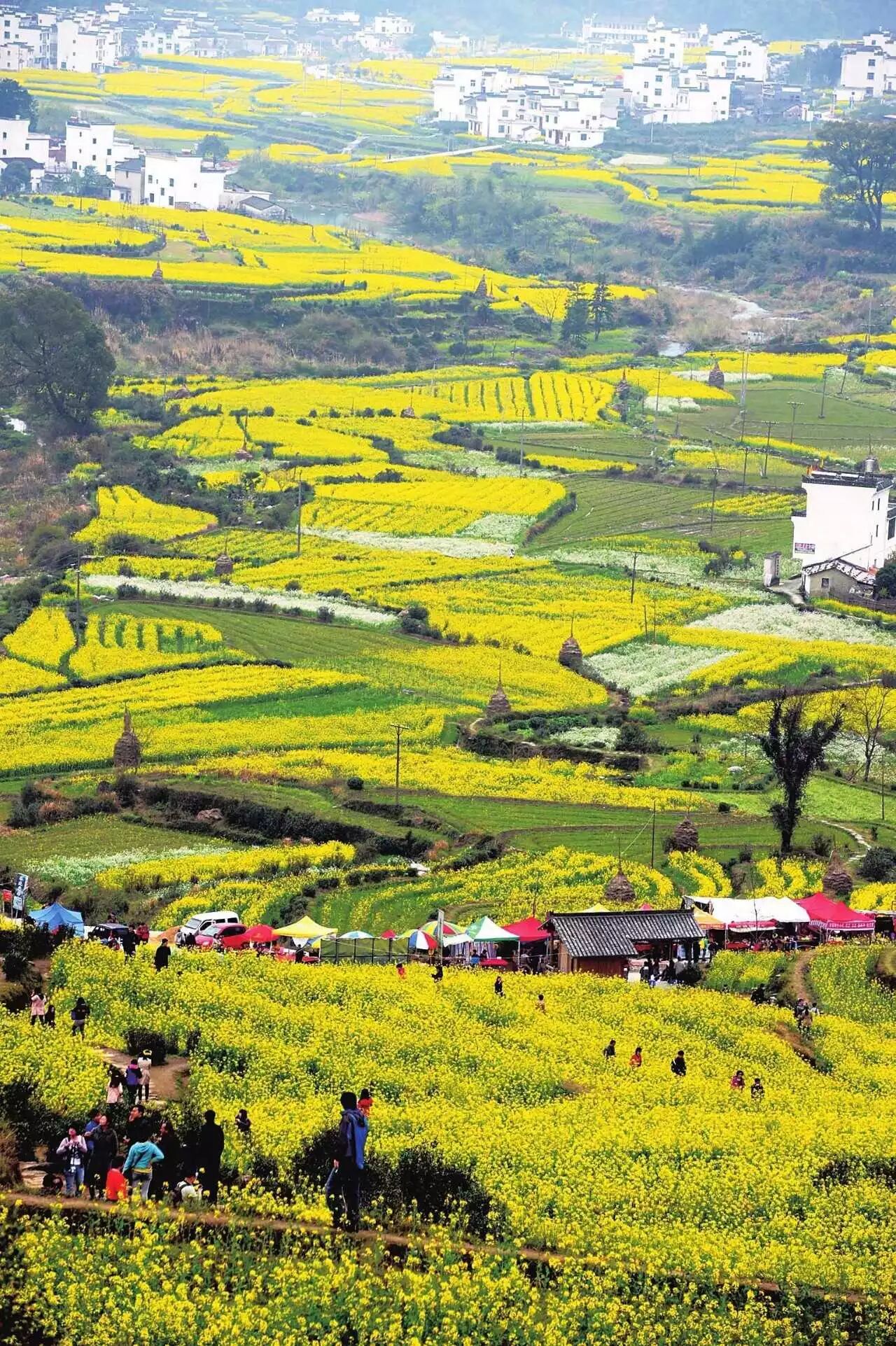 独特的梯田地势与白墙黛瓦的徽派建筑群交相辉映,秀气而瑰丽。粉红的桃花、洁白的梨花,点缀在金灿灿的油菜花田中,俨然一幅的乡村田园画卷,春风吹过,生意盎然。