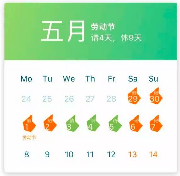 如何拼假:5月2日到5月5日请假4天,可连休9天