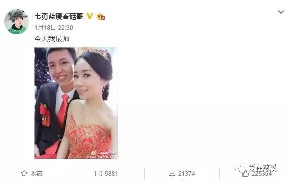 2016年,广西小伙的失恋视频在网络疯狂转发,因为口音的关系,小伙口中的“难受想哭”变成网络热词“蓝瘦香菇”,众多名人也纷纷模仿。最近,蓝瘦香菇哥(@韦勇蓝瘦香菇哥)在微博上发出一条博文,称自己最帅,配图是他和苦恋6年的女孩子结婚了。网友们大为兴奋,并为他的喜事感到高兴。