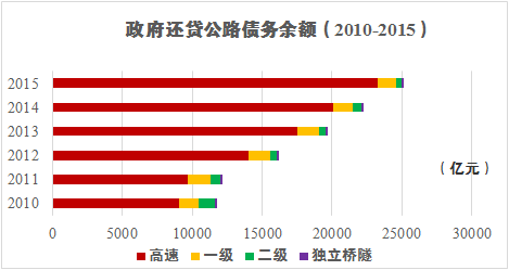 2015年全国收费公路收支平衡结果为-3187.3亿元。与2010年至2014年(收支平衡结果依次为:32.5亿元、-323.3亿元、-565.7亿元、-660.5亿元和-1571.1)相比,收支缺口进一步扩大。