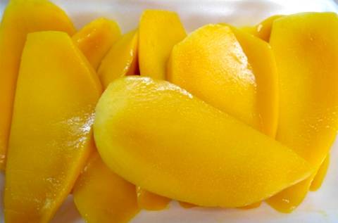 1.芒果洗净削皮后,用刀将芒果切成厚度大约0.3公分的片状;