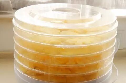 3.菠萝片放入烘干机内摆好,温度设定在60-70度之间,时间大约8小时以上,按照个人口味控制烘干时间。烘干后取出,放凉后即可食用。