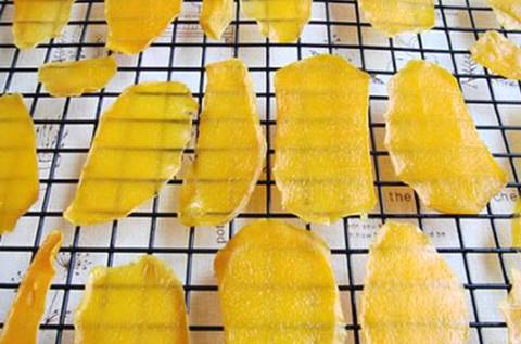 3.待浸泡芒果片的糖液冷却,放入冰箱冷藏3小时后,将芒果片取出,一片一片放到晾架子上,放置在阴凉通风处1天后,即可食用。