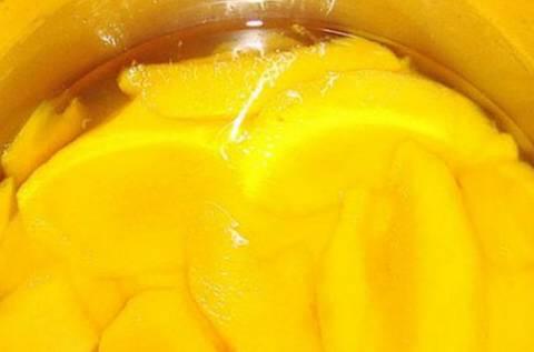 2.锅中倒入100g清水和30g冰糖,中火煮至冰糖完全溶解后关火,倒入芒果片浸泡;