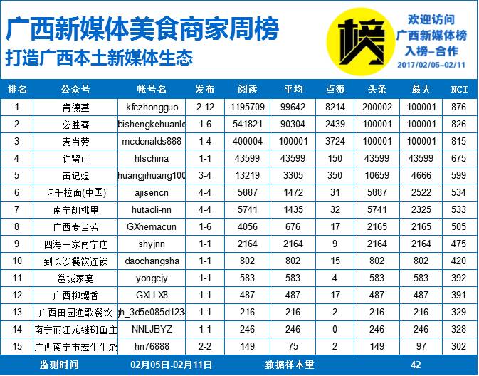 首页 | 母婴百科 | 广西新媒体美食周榜 | 2017/02/05-02/11 广西新媒体美食周榜 | 2017/02/05-02/11 2023-04-19 23:50:29 广西新媒体榜是广西创客中心孵化的移动互联网(新媒体)项目,隶属广西新媒体研究中心,线下社群为广西新媒体联盟,联合70多位新媒体创始人,运营的新媒体超过300个。NCI计算公式