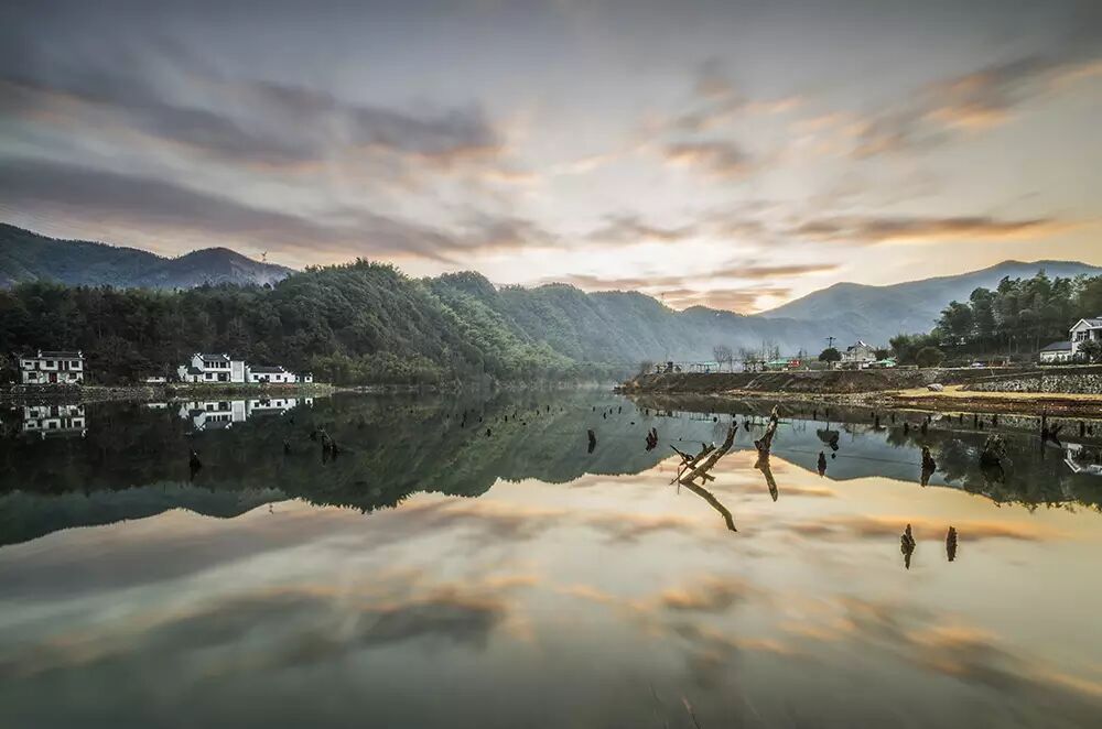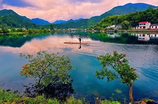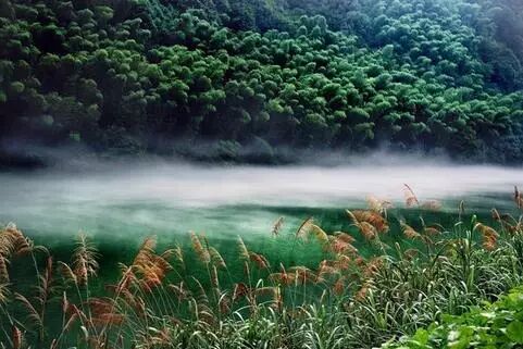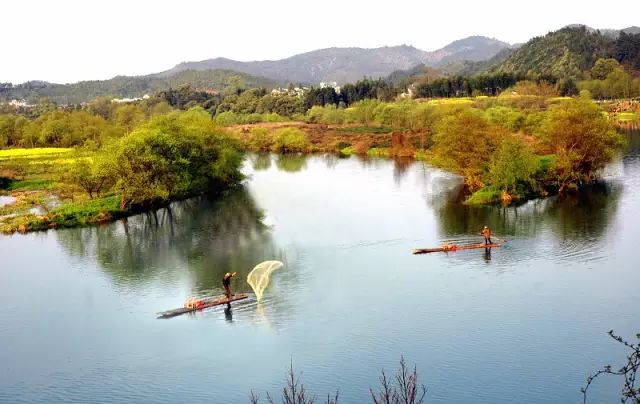 远山如黛,近水含烟,两岸的树木展开茂密的枝叶俯身溪水,好似在欣赏自己的倩影。