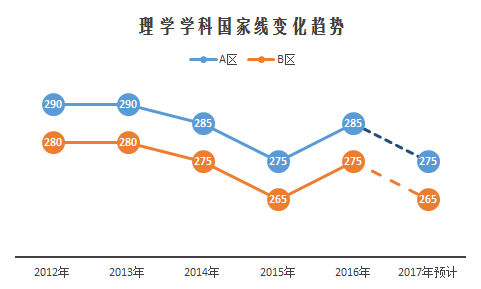根据往年分数线以及影响分数线变化的原因综合预测,今年理学学科A区分数线为275左右,B区分数线为265左右。