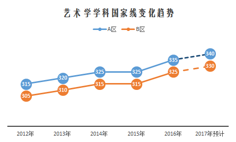 根据往年分数线以及影响分数线变化的原因综合预测,今年艺术学学科A区分数线为340左右,B区分数线为330左右。