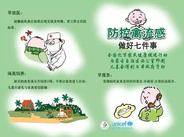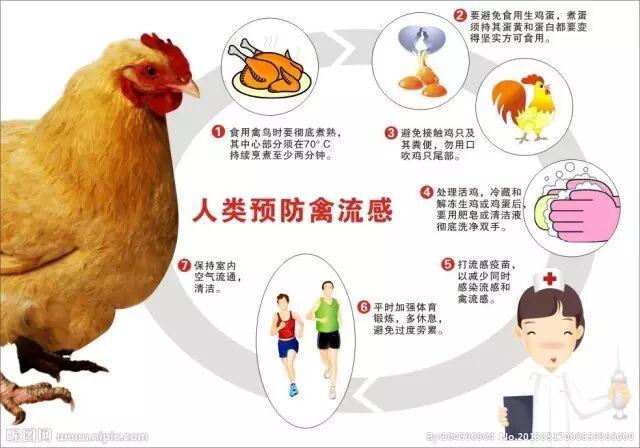 5. 及时就医。如果出现发热、头痛、鼻塞、咳嗽、全身不适等症状时,应佩戴口罩,尽快到医院就诊,并主动告诉医生自己发病前是否接触过禽类及其分泌物、排泄物,是否到过活禽市场等情况,以便医生及时、准确做出诊断和给予针对性的治疗。