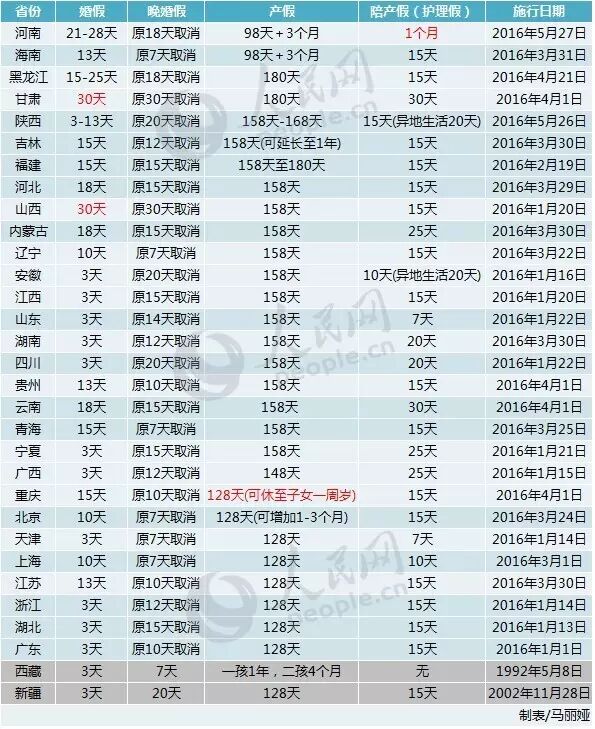 这29省份的新计生条例中均取消了原有的晚婚假,同时对产假和男性陪产、护理假做出一定调整。山西、甘肃婚假达30天,重庆女性产假在128天基础上可延长休至子女一周岁,河南的男性陪产假有一个月,这一点对男同胞来说,确实是好消息。