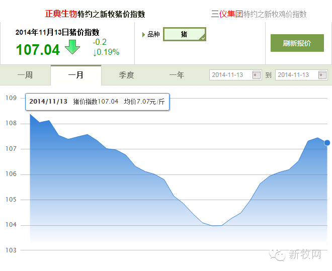 来自新牧网分析 11月13日新牧猪价指数107.04,较昨日下跌0.2,今日全国生猪均价弱势稳定在7.07元/斤。现阶段各地整体猪源供应量下降,各区域猪价逐步回升,预计明天猪价指数将以小幅调整为主。