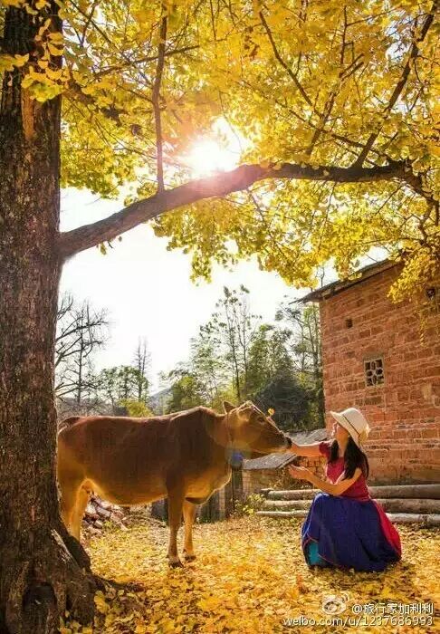 滨洞村的银杏树下,是我和一头牛儿嬉戏的时光。我撷一片金叶给牛儿装扮。