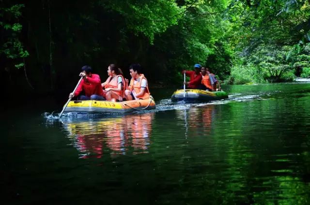 古龙山漂流还有个招牌的名字,叫漂“三天三夜”,这并非真要漂三天三夜那么长,而是要漂过三个溶洞,犹如白天黑夜交替,因而得名。从洞中出来,回首身后漂过的地方,青山依旧,流水潺然,一切恍如隔世。