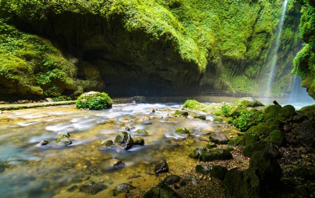 通灵大瀑布高188.6米,宽30米,气势磅礡,水顺着崖顶地缝倾流而下,非常壮观,峡谷内还有奇异的植被、溪流和山洞,被人们称为“通灵奇观”。