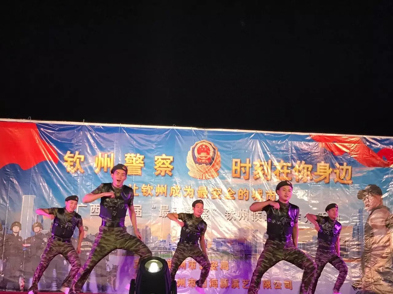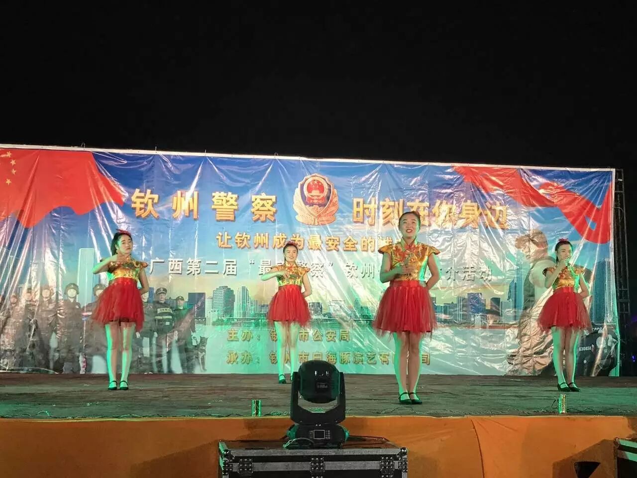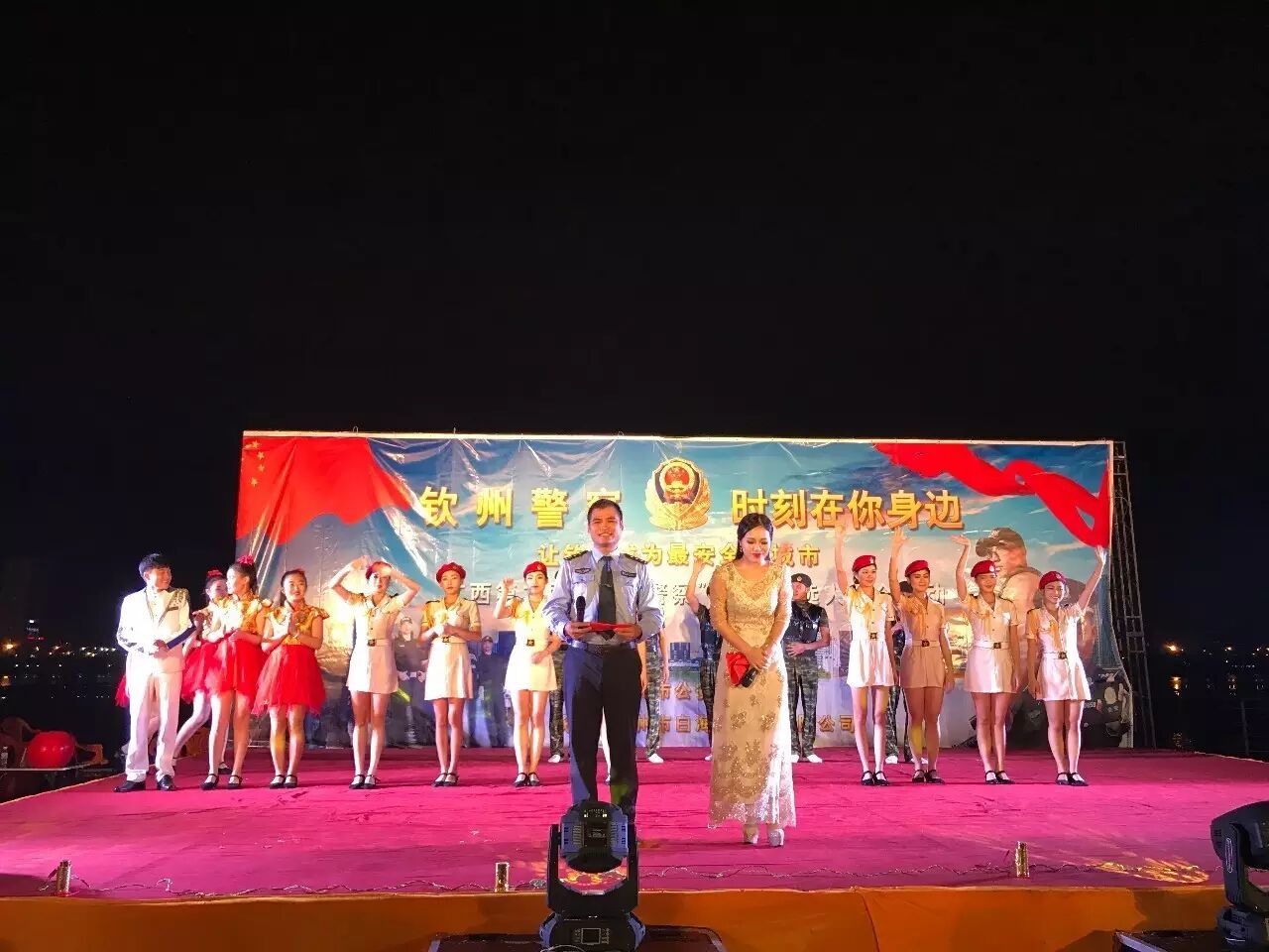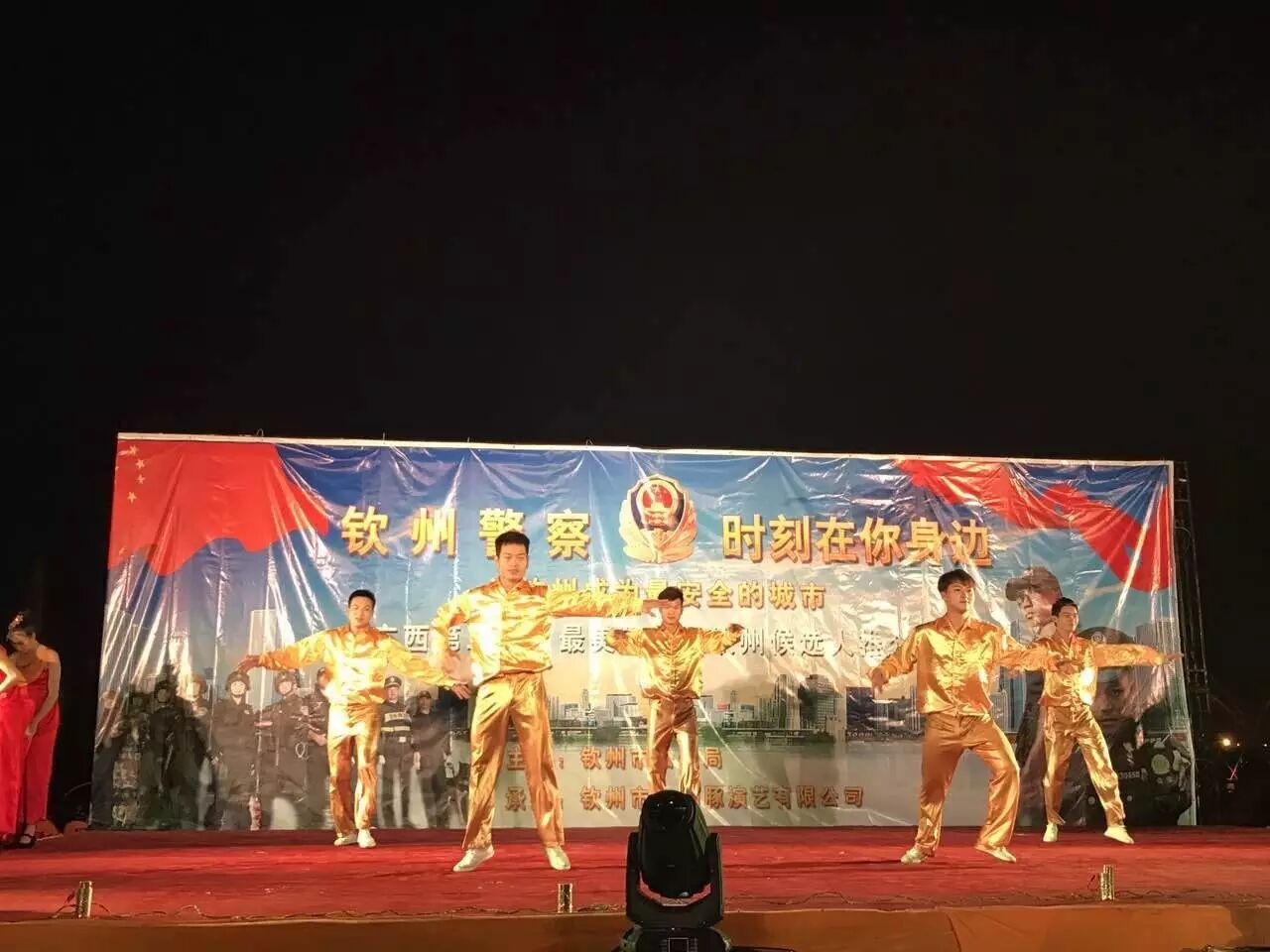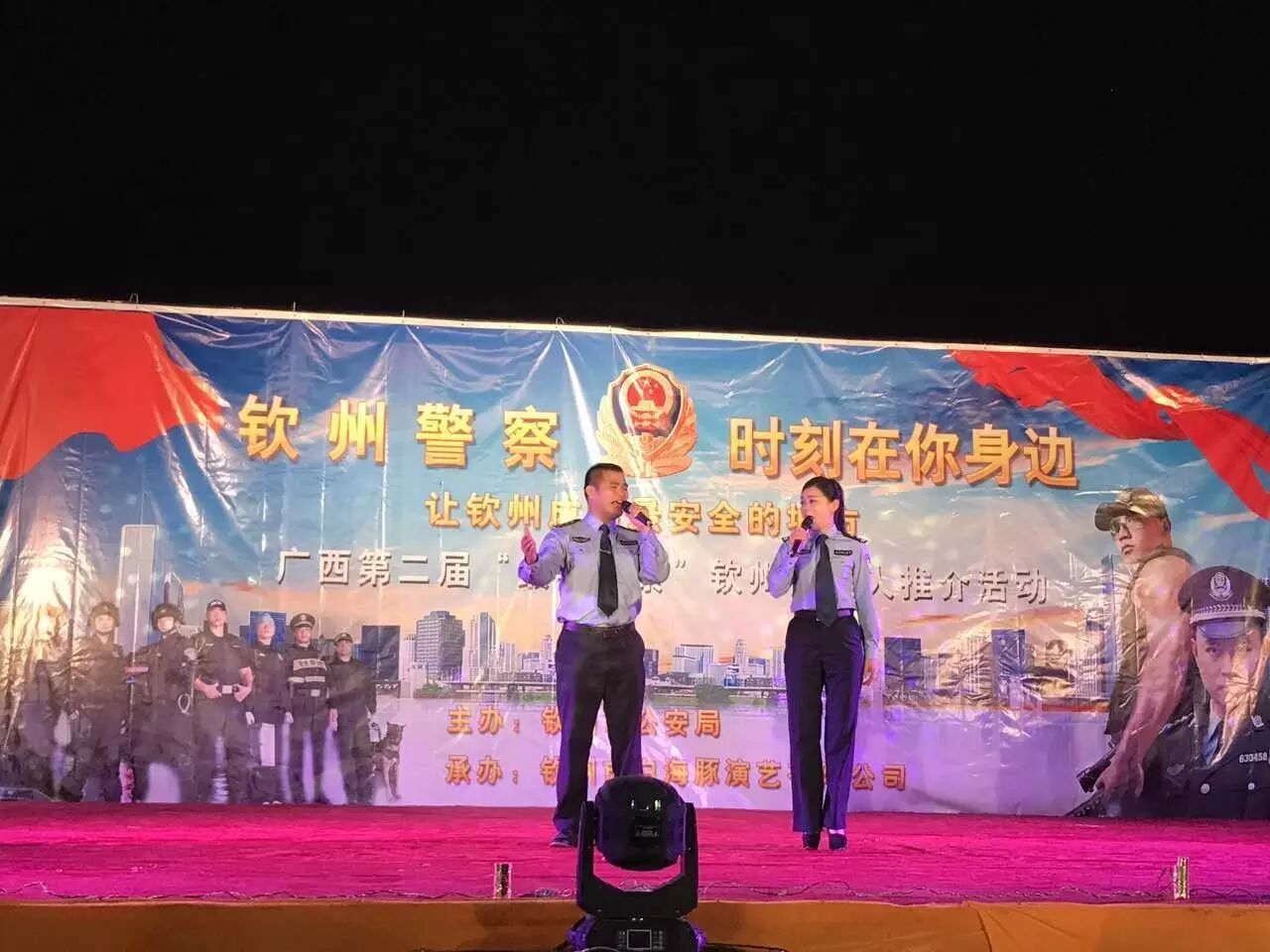 为构建钦州社区平安和谐家园,促进钦州社区社会治安持续稳定,加强与社区群众的沟通,进一步提升群众安全感和满意度,,钦州市白海豚演艺有限公司承办的以“钦州警察.时刻在你身边”为主题的演出活动,活动共三场,演出时间和地点分别在:11月19日钦州湾广场、11月18日白石湖音乐广场、。