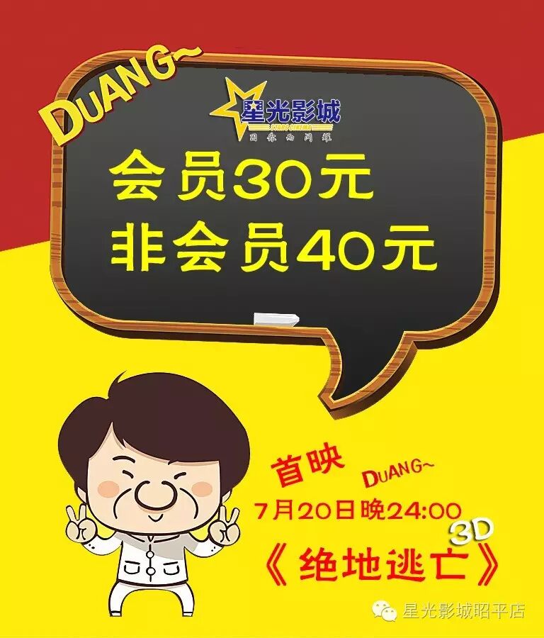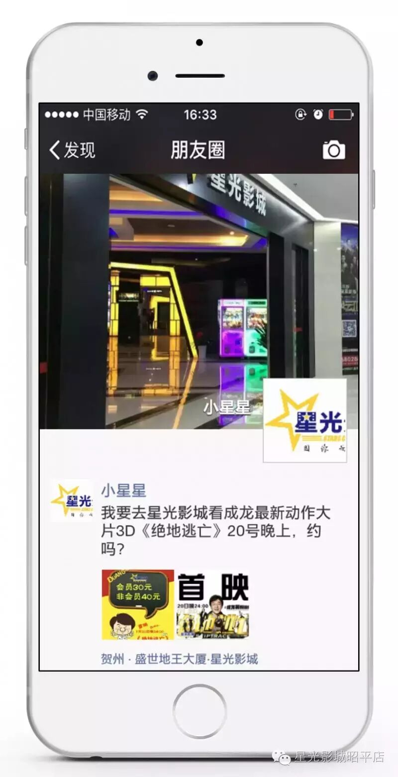 将下面两张图片发到朋友圈,并附上一句“我要去星光影城看成龙最新动作大片3D《绝地逃亡》20号晚上,约吗?”