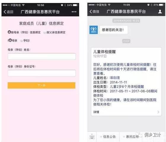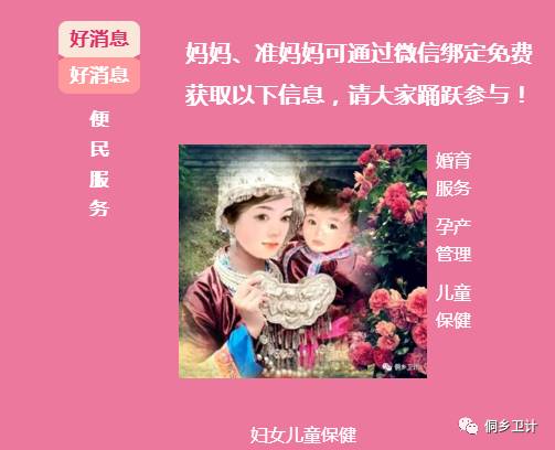 1111为推进广西壮族自治区 “四册合一”的新时期母子健康信息系统建设,实现“横向到边,纵向到底”“一机在手、四册都有”的管理目标,及时向《桂妇儿健康服务信息管理系统》的婚育服务人群、孕产管理人群、儿童保健人群、妇女保健人群免费提供便捷的信息惠民服务。;广西健康信息惠民平台>妇幼健康服务信息微信提醒服务绑定工作的通知》要求,三江县卫计局决定在全县范围内开展《广西健康信息惠民平台》妇幼健康服务信息提醒服务绑定工作。凡在我县各医疗保健机构参与婚育服务、孕产妇保健、儿童保健服务对象都可绑定《广西健康信息惠民平台》公众号,并登记绑定信息,可实时自动获取宣传信息、个人检查信息和提醒服务信息。