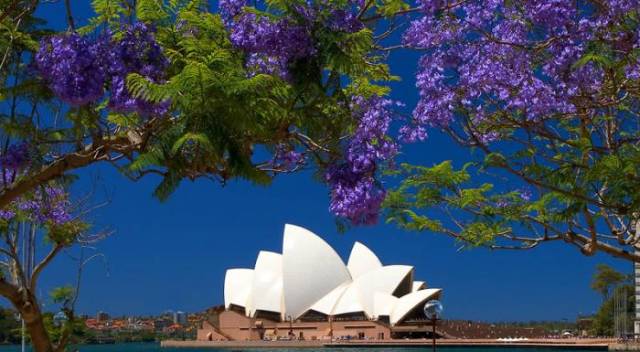 闻名于世的悉尼歌剧院,与蓝花楹Jacaranda之树相映成辉,成为一道亮丽的风景线。