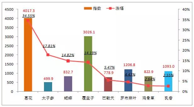 本期价格上涨稍大的品种有葛花、太子参、蟋蟀、覆盆子、巴戟天、罗布麻叶、鸡骨草、乳香等。