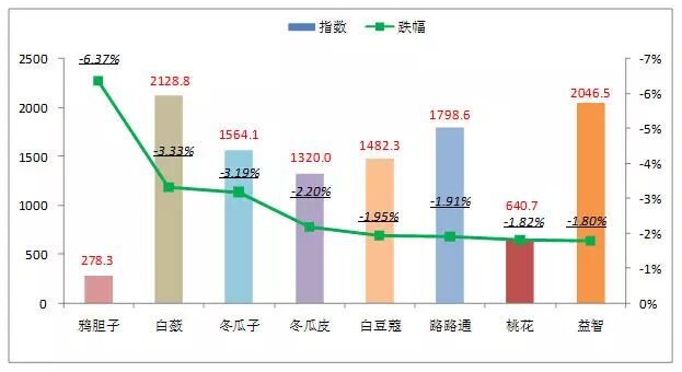 本期价格下跌稍大的品种有鸦胆子、白蔹、冬瓜子、冬瓜皮、白豆蔻、路路通、桃花、益智等。