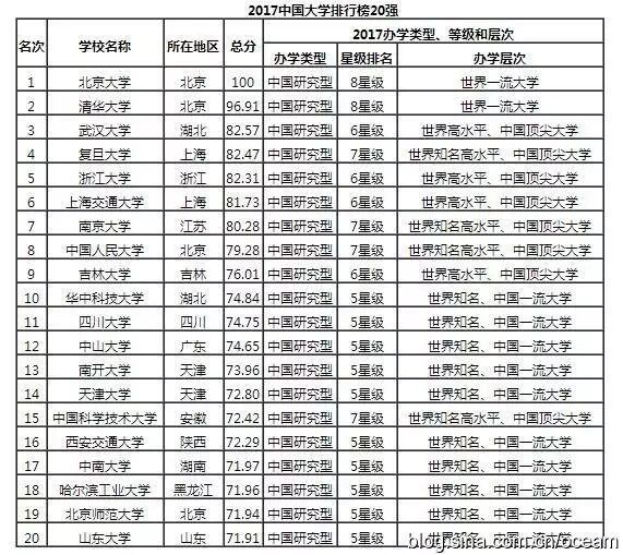 2017中国大学排行榜100强,北大、清华位列第一、第二名。第三名武汉大学,三所学校均与其他两个版本不一样。
