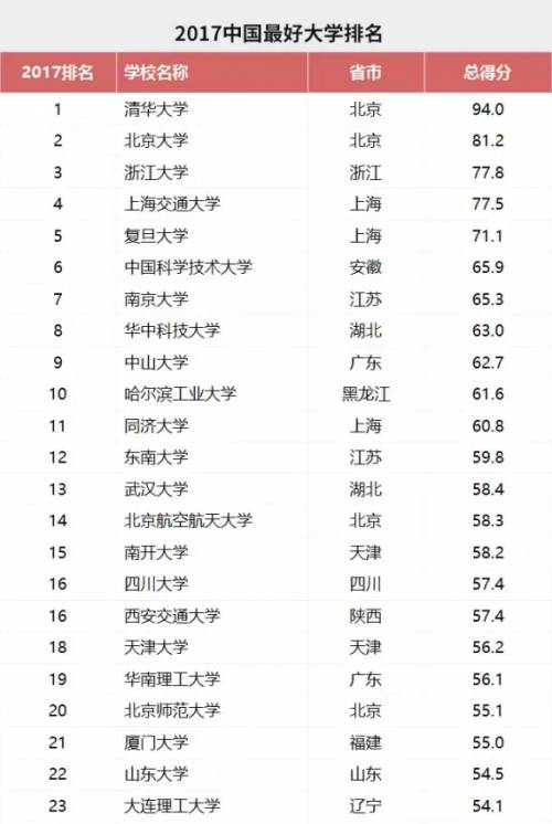 2017年中国最好大学排名五百强,清华、北大、浙大位列前三。