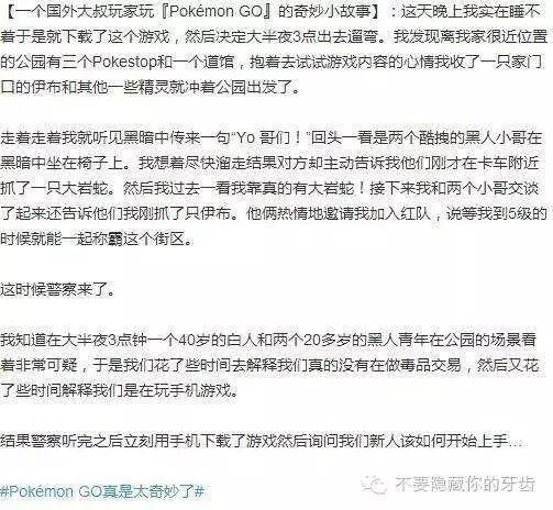 一美国大哥半夜3点出门玩pokemon go→去道馆路上被俩黑人兄弟缠住→大哥拔腿想跑却被真情挽留说加入我们吧一起制霸街区→三人一见如故刷起了大岩蛇→这时警察叔叔走来说你们深夜公园私会是不是肮脏的毒品交易→一白两黑三脸懵逼百口莫辨只好亮出游戏→警察一看卧槽好玩当场下载加入队伍一起嗨