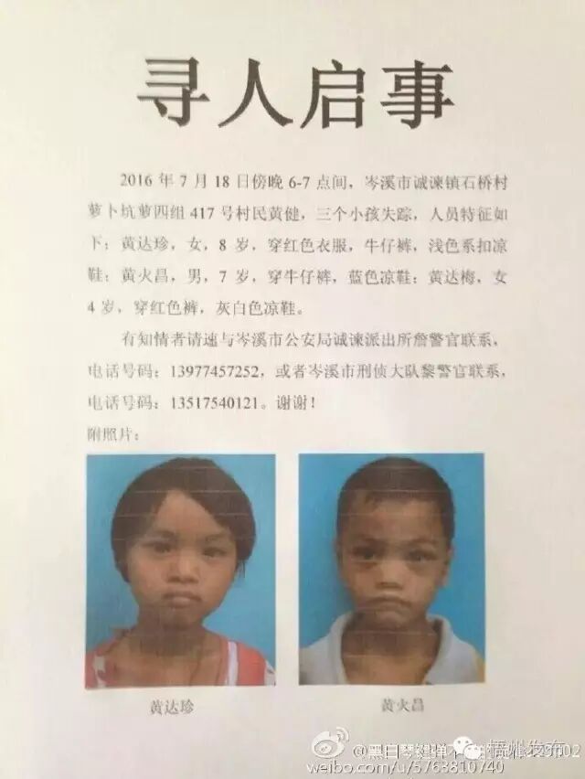 2016年7月18日21时许,,诚谏镇石桥村的黄某的三个小孩(分别是8岁、4岁的女儿和7岁的儿子)失踪,要求出警帮忙寻找。