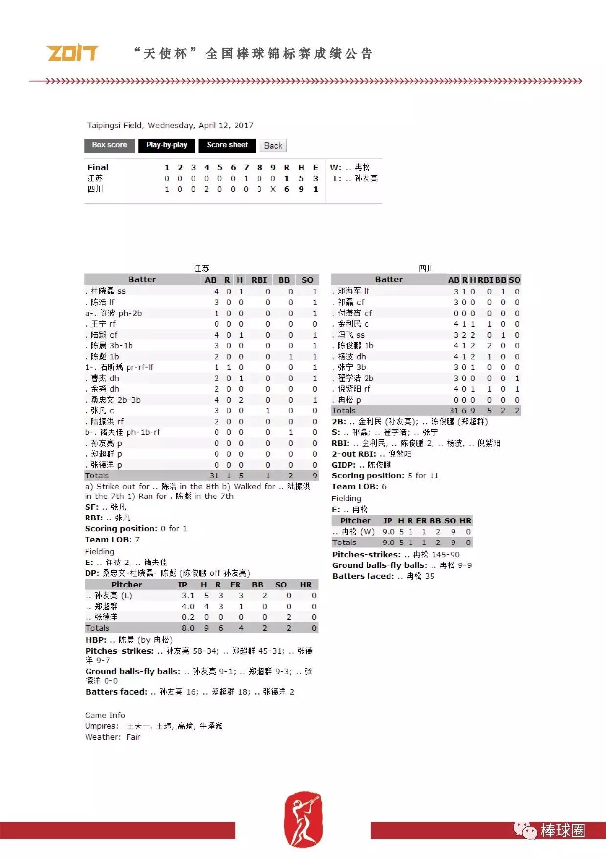 四川有分在手发挥更加顺利,战至第七局已经3比0领先,但本局江苏队的进攻有所收获,张凡的高飞牺牲打攻下一分,关键时刻冉松发挥危机处理能力,两出局二三垒有人满球的局面下投出曲线球三振对手,最后一鼓作气完投九局,