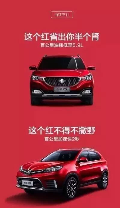 上汽名爵:这个红省出你半个肾/不得不撒野,隐喻低油耗和强劲动力。