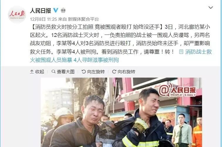 消防官兵干了伟大的事,我相信消防官兵也不渴求你的称颂。但是,你殴打消防战士,还消防战士并没有还手,高低立判,贵贱立见。