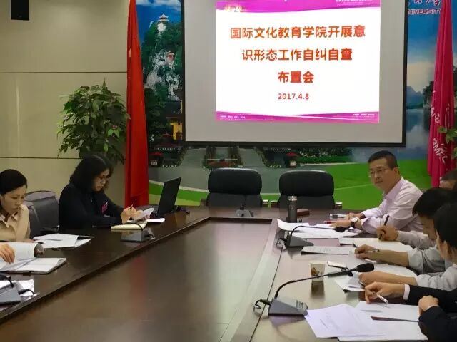 会上詹副书记传达了《关于印发广西师范大学开展意识形态工作专项巡察方案的通知》(师党[2017]69号)的文件精神,就学院意识形态工作的现实状况进行分析研判,对重点清查的内容进行了说明。学院党委书记戴家毅对我院意识形态领域工作提出了任务要求,根据学校意识形态工作责任制考核检查内容进行了具体的责任分工和安排,并进行了具体工作布置。她强调,学校是意识形态工作的重要阵地,必须牢牢坚守。我单位为外事行政单位与教学学院合一的单位,尤其要注意抓牢意识形态工作,加强对师生员工的师德师风及职业责任培养,,加强报告会、讲座、沙龙的规范管理,加强新媒体账号、学生社团管理,。全院要认真贯彻落实学校关于意识形态工作责任制的要求,进一步增强抓意识形态工作的紧迫感、责任感和使命感,营造和谐健康的意识形态环境氛围。