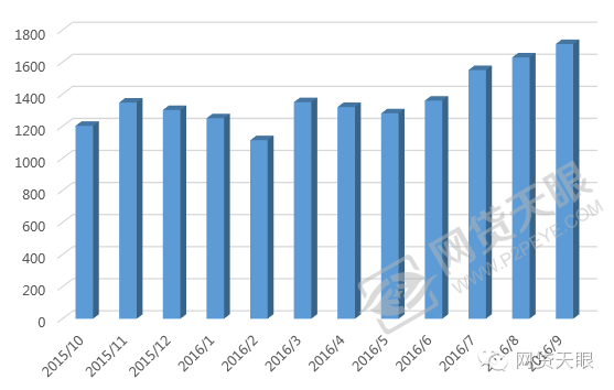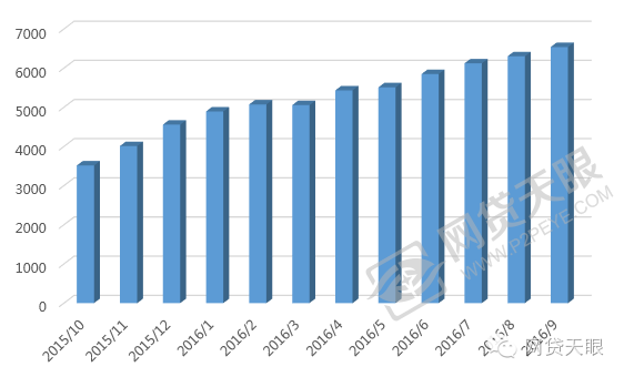 众所周知,贷款余额是平台历史累计应还的贷款总量,贷款余额能够反映平台在一段时间内的业务规模发展情况,贷款余额增加的越快,表示该行业业务扩张的越快。总览行业近一年变化,随着成交额逐渐走高的趋势,贷款余额总体呈现单边快速增长的态势,截止到2016年9月底,贷款余额为6538.11亿元,屡创历史新高,环比增长3.75 %,是去年同期贷款余额的2.06倍,说明金融行业大部分的资金倾向于P2P网贷行业,预计未来还会出现较高增长。