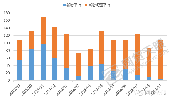 2016年9月新增问题平台104家(不包括非近期),新增平台4家,创近一年来历史最低,相比上月,新增问题平台环比增长33.33%,总体看,新增问题平台总数是新增平台总数的1.96倍,究其原因,是因为在2016年8月24日,银监会发布的《网络借贷信息中介机构业务活动管理暂行办法》明确作出了限额政策,,导致一些平台无法获得网贷行业认可,致使P2P网贷行业每月新增平台数量逐步减少,每月新增问题平台数量逐步增多。