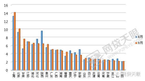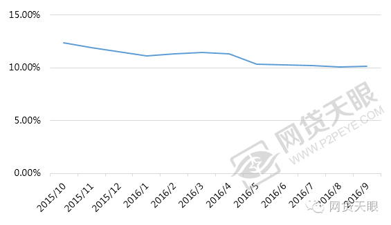 自2015年10月至2016年9月,网贷行业的综合利率整体为下降趋势,,不合规平台的加速出局,投资人也不再盲目追求高收益,8月行业平均利率为10.15%,与上月持平。