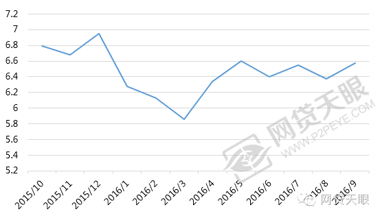 2016年9月网贷行业平均借款期限为6.57个月,略高于上月期限。预计随着未来大额标平台的退出,车贷、消费贷这类中短期平台的升温,平均期限会有所下降。