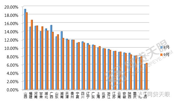 总体看,上述地区中有15个地区平均利率高于行业平均水平,其余地区均低于行业平均。其中山西的平均利率为18.52%,全国最高,其次是福建地区的利率,利率为16.73%,江西的利率最低仅为6.35%。