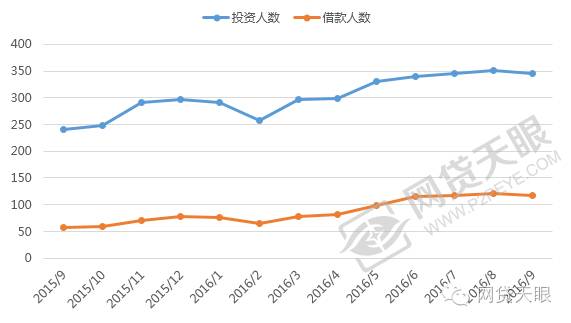 2016年9月,网贷行业的投资人数和借款人数相比上月有所下降,分别为345万人和116万人,分别环比下降1.4%和3.31%,从2015年9月到2016年9月,近13个月投资人累计3932万人、借款人累计1231万人(不去重复),总体看,投资人和借款人变化趋势一致,均保持缓慢平稳上升或下降的趋势,两者存在协整关系,预计未来,投资人与借款人活跃度依旧有所上升。