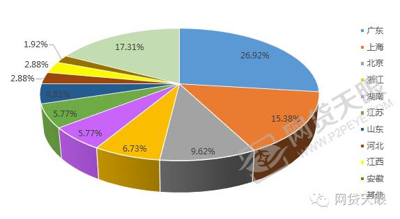 2016年9月新增问题平台104家,环比上涨33.33%,同比上升92.59%。104家问题平台分布在全国23个地区,分布范围比较广泛。其中广东本月新增问题平台28家,占本月新增问题平台总数的26.92%,占比相比上月增长近9个百分点;上海新增加16家问题平台,北京本月新增10家问题平台,此外,浙江、湖南、江苏和山东本月分别新增7、6、6、5家,其余地区本月新增问题平台均不超过3家,差异较小。