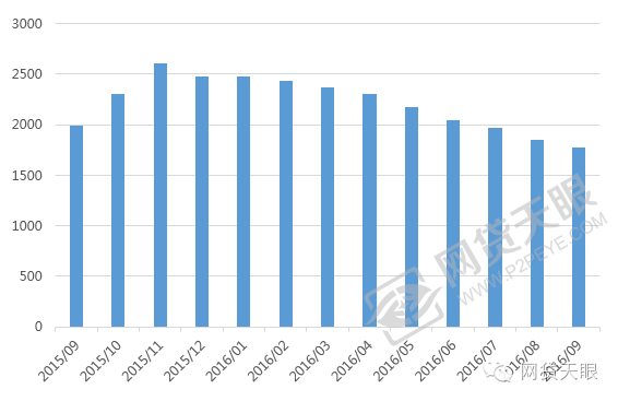 2016年9月网贷行业在运营平台数量依旧下降,9月份在运营平台数量为1776家,相比8月份下降了71家,环比下降了3.84%,同比下降10.71%,即7月份在运营平台数量首次跌破2000家后,9月运营平台数量达到历史最低值,进一步说明行业加速整治,P2P网贷行业正朝着良性趋势发展。