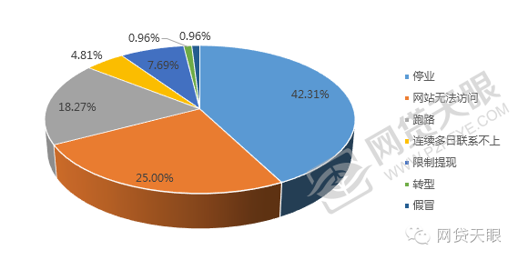 本月新增问题平台以停业为主,据统计本月104家问题平台中,有44家平台发布停业公告,占本月新增问题平台总数的42.31%,占比高于2016年8月,其次为网站无法访问,共26家平台,占问题平台总数的25%,此外有19家平台跑路,8家平台限制提现,5家平台连续多日联系不上,转型和假冒其它平台各1家。