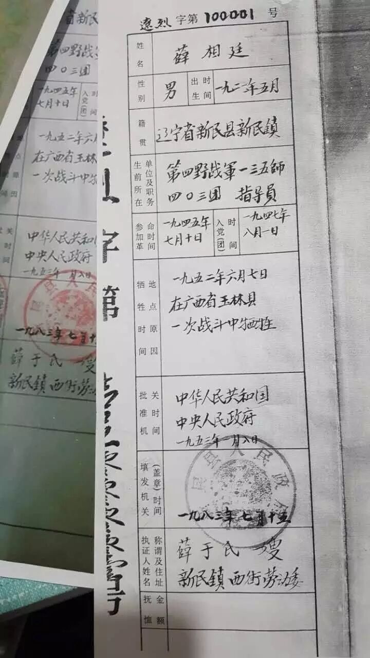 记者联系上了“我同学”薛伟,在浙江省衢州市工作。他说,二爷是东北对二叔的称呼,他的二爷原名叫薛俊,是辽宁省新民县新民镇人,出生于1921年,有四个兄弟姐妹,薛俊排名老二,青年的时候偷偷瞒着家里人参加了抗联,为了不连累家,改名薛相廷。,他被编入了第四野战军135师403团,还担任了指导员。