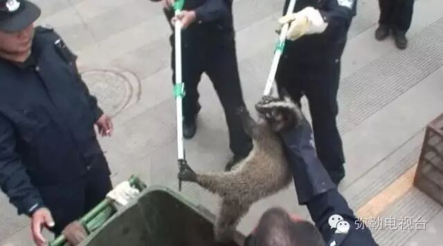 民警戴上防护手套,使用捕捉器,小心靠近,先用捕捉器控制住,然后一民警在垃圾桶底将惊跳不已的小动物拿出来,。