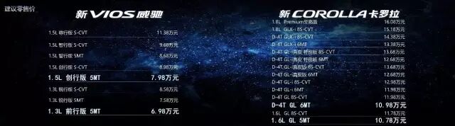 其中,新VIOS威驰共推出1.3L及1.5L两种动力8款车型,售价区间为6.98-11.38万元;新COROLLA卡罗拉共推出1.6L、1.8L及D-4T直喷涡轮增压发动机三种动力14款车型,售价区间为10.78-16.08万元。双车无缝隙覆盖6-16万元价格区间,为消费者带来更丰富、优质的选择。