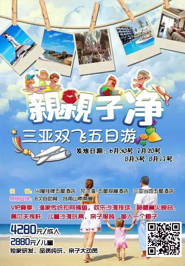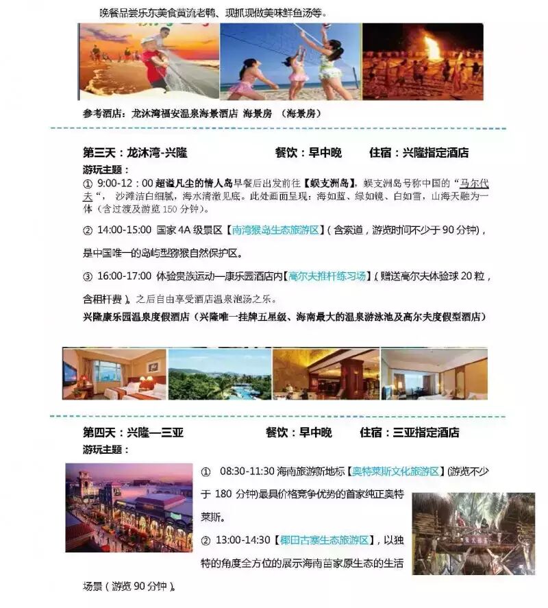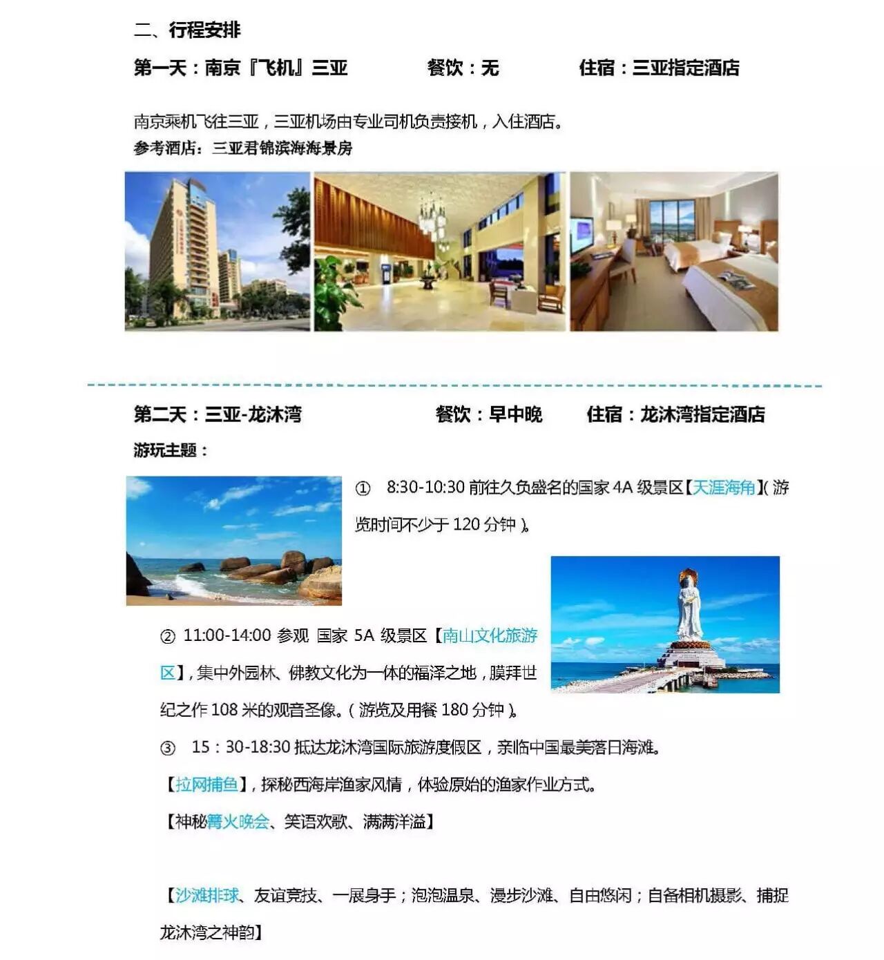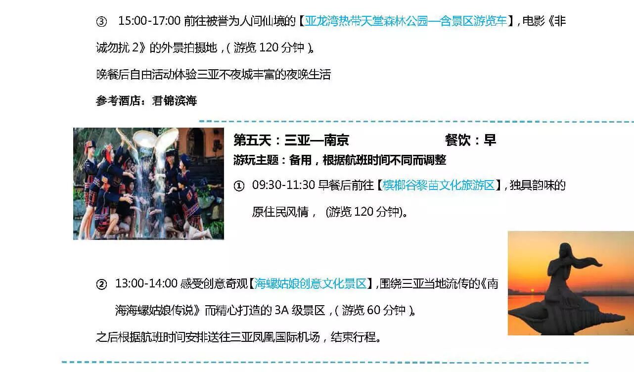 景 点: 蜈支洲岛、南湾猴岛、南山文化苑、天涯海角、亚龙湾天堂森林公园、椰田古寨、槟榔谷