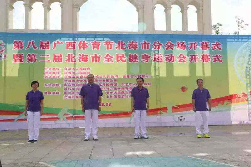 当天,第八届广西体育节北海分会场开幕式暨第二届北海全民健身运动会开幕式同时在园博园举行。北海市委常委、市委副书记蔡中平,市人大常委会副主任谢安河,市人民政府党组成员卓英子,市政协副主席杨志远出席了当天活动。蔡中平宣布活动开幕。拉开了全民健身系列活动序幕。