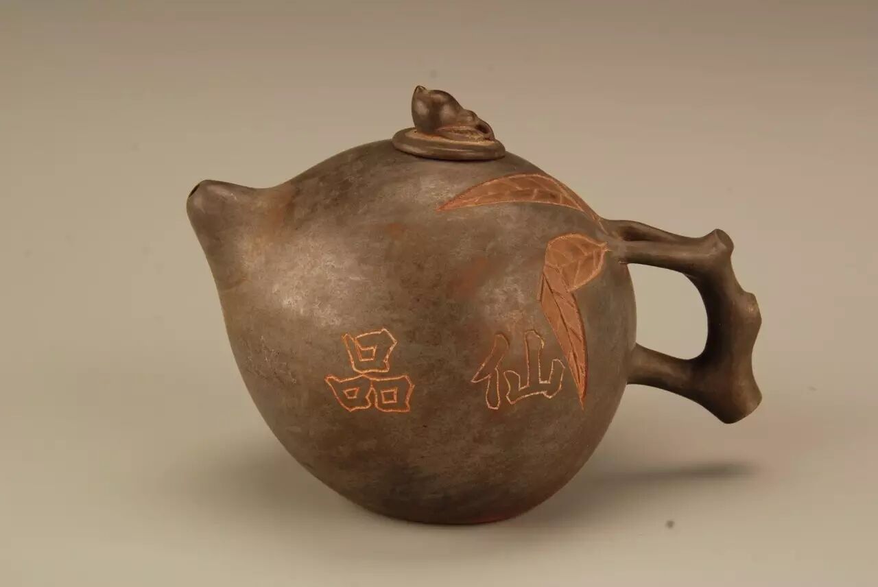 二级文物。壶身以硕大丰满的寿桃为主体,线条圆润饱满,刻有桃叶图案;盖上竖一小桃,折枝为钮;桃枝为鋬,曲折有度;流短而上翘,直指青天,刚柔并济,与壶腹桃沟线条自然衔接。壶鋬桃枝浑健有力,壶身桃叶飞扬灵动,二者过渡巧妙。