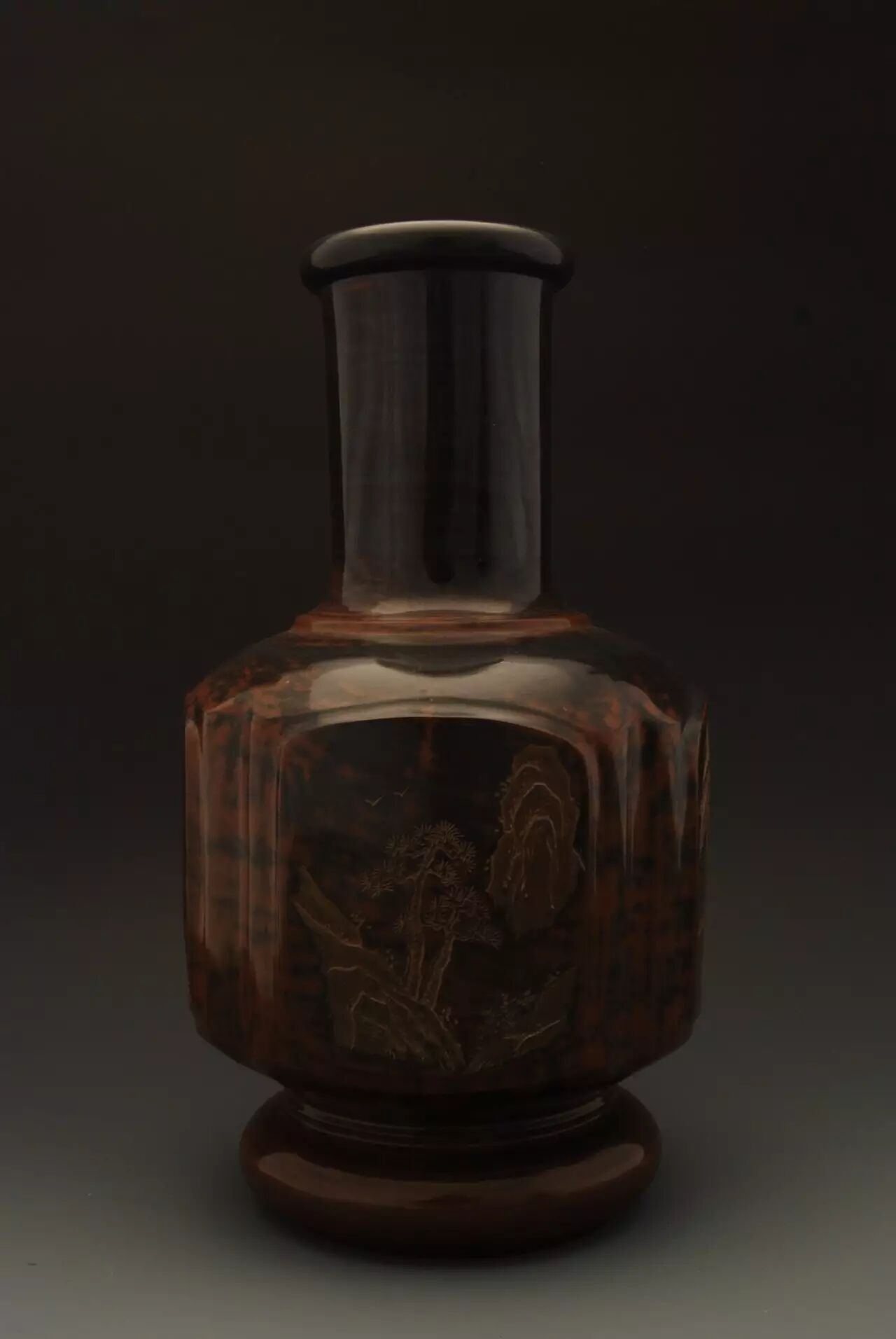 二级文物。小口短颈,型如葫芦,瓶体上下过渡平缓。瓶身刻花草纹,雕工古朴雅致。刻痕内填白泥烧成红器白花效果,古色古香。瓶体质地细腻,色泽光润柔和。因烧造过程中窑变自然产生的铁青、虎纹的色彩纹理神奇而绚丽。