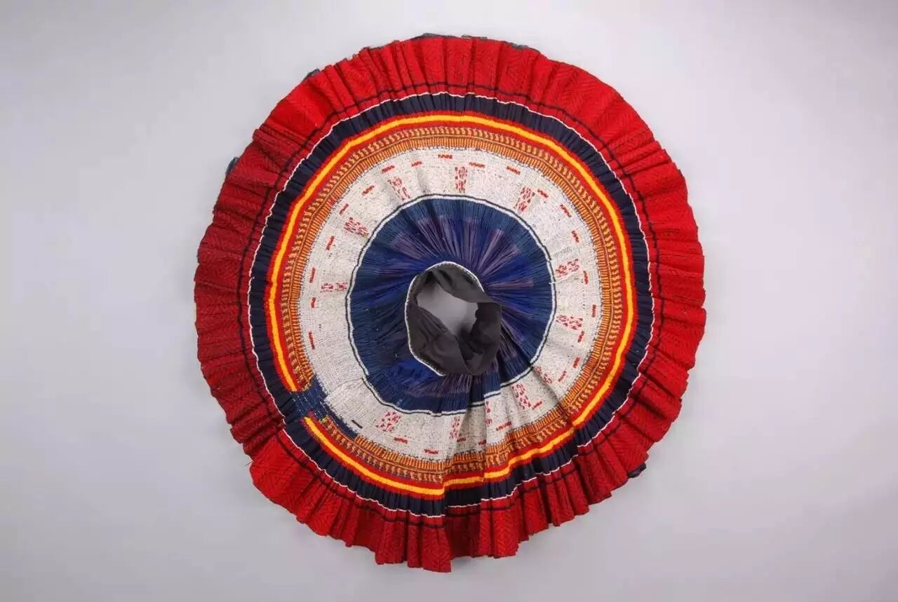 裙为黑布刺绣制成的百褶裙,展开呈圆环形。根据布料和色彩主要分为四圈:由上至下分别为黑色土布、白色蜡染布并有零星红色刺绣、黄红色线作几何纹挑花、红色线滚针绣菱形几何纹,并在上部用一圈白色线锁绣提亮裙身色彩,与前面的白色蜡染相呼应。整件百褶裙刺绣严谨工整,色彩以红色为主色调,彰显出穿裙姑娘的美丽与富贵。