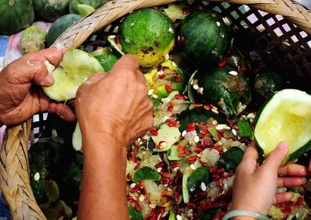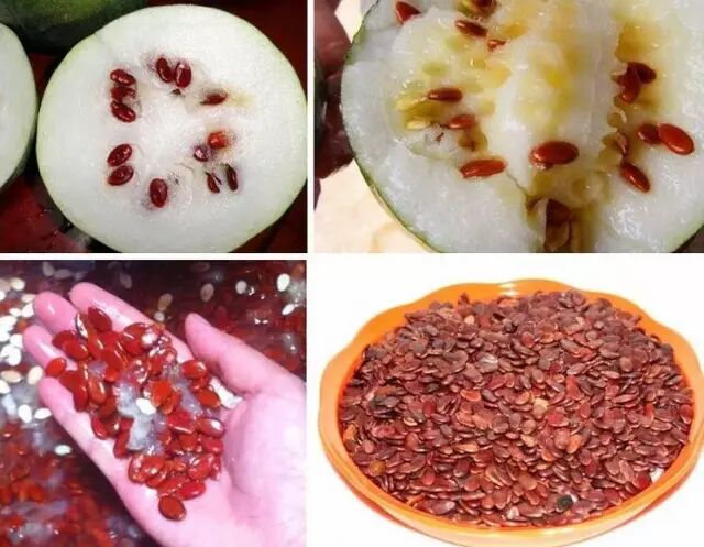 乳白色的瓜瓤里镶嵌着一粒粒火红的瓜子